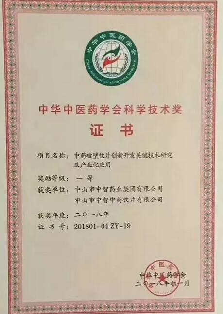 11月25日,中山市中智药业集团有限公司申报的“中药破壁饮片创新开发关键技术研究及产业化应用”项目,荣获2018年度中华中医药学会科学技术奖一等奖。