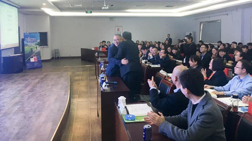 中智药业集团副总裁曹晓俊的主题分享结束后 与漱玉平民董事长李文杰友谊拥抱,合作共赢