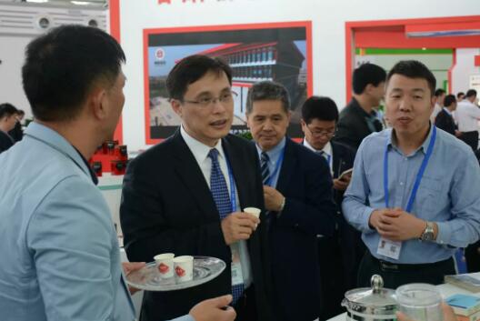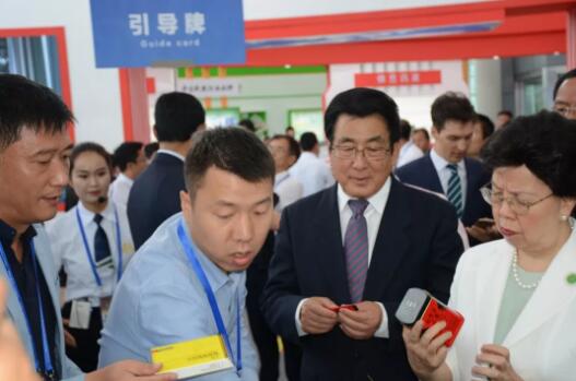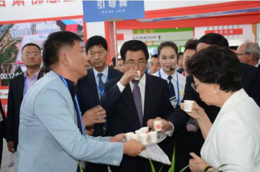 甘肃省委书记林铎(右二),世界卫生组织荣誉总干事陈冯富珍(右一)到中智药业展台考察,品尝黄芪破壁草本。
