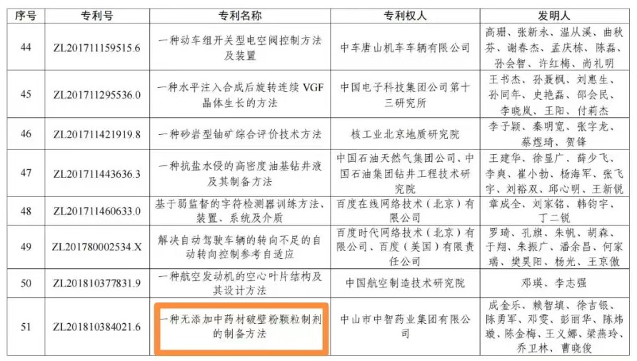 2022年7月22日,国家知识产权局发布第二十三届中国专利奖授奖决定,广东省创新中药企业中智药业集团“一种无添加中药材破壁粉颗粒制剂的制备方法”发明专利,获得本届中国专利银奖。