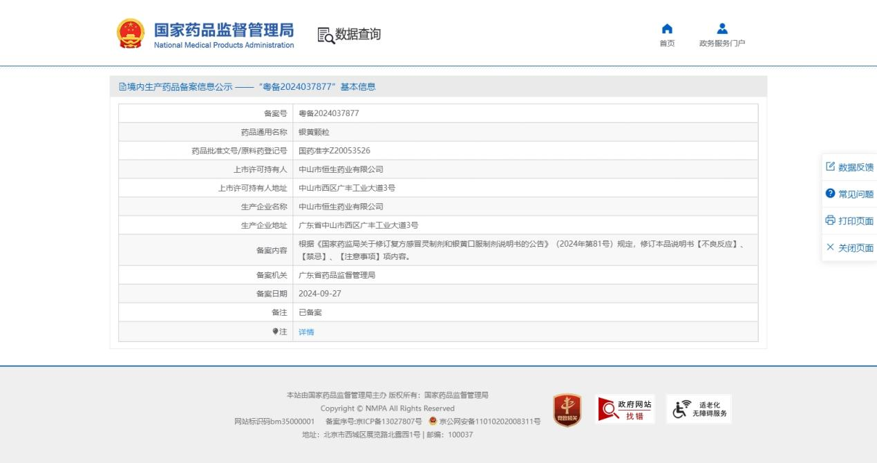 根据《国家药监局关于修订复方感冒灵制剂和银黄口服制剂说明书的公告(2024年第81号)》要求,企业应在2024年9月27日前报省局备案进修订包装、说明书等内容,详细情况如下: