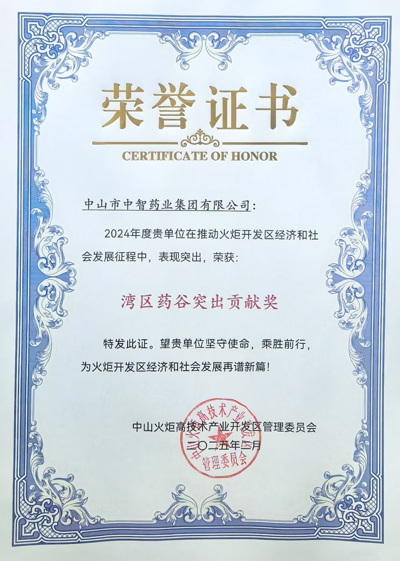 2月6日,在中山火炬开发区高质量发展大会上,中智药业集团凭借2024年度在推动火炬开发区经济和社会发展征程中的突出表现,荣获“湾区药谷突出贡献奖”。作为粤港澳大湾区西岸生物医药创新高地的重要成员,中智药业以中药现代化创新实践树立行业典范。
