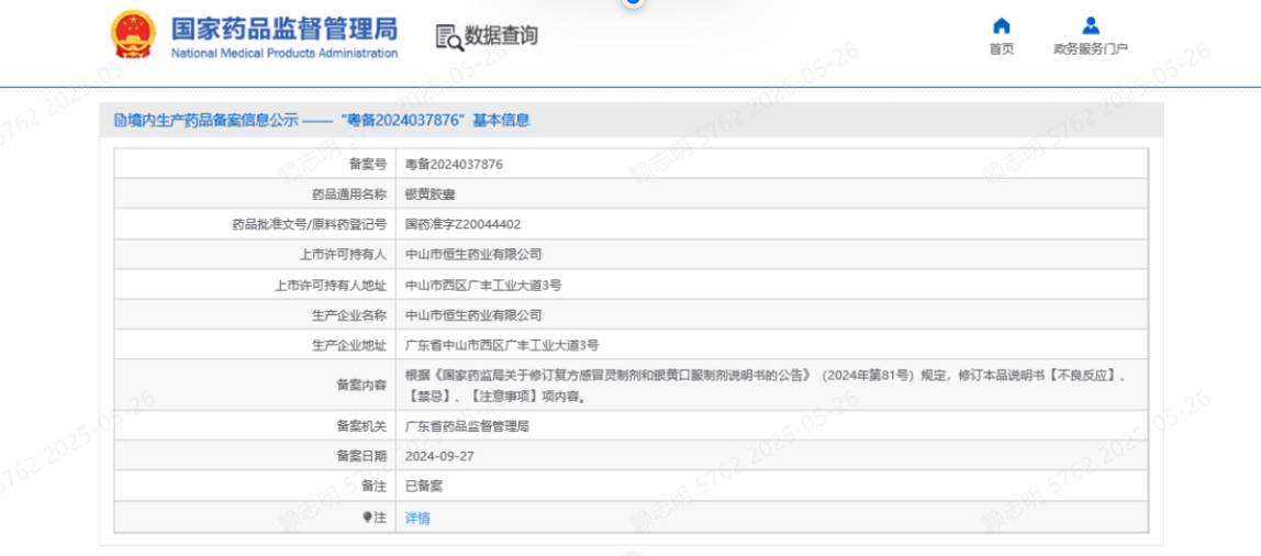 依据《国家药监局关于修订复方感冒灵制剂和银黄口服制剂说明书的公告(2024年第81号)》要求,我司已对银黄胶囊(国药准字Z20044402)药品说明书中【不良反应】、【禁忌】、【注意事项】项进行了修订,并于2024年9月27日通过广东省药品监督管理局备案(备案号:粤备2024037876号,详见附件1《备案证明》)。修订后的说明书符合《药品说明书和标签管理规定》(局令第24号)及现行法规要求。
