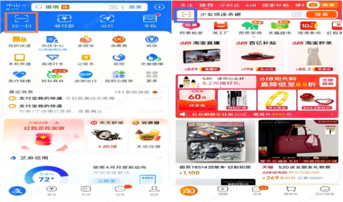第一步:手机打开支付宝或淘宝,点击“扫一扫”,进入扫码页面