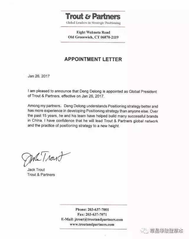 杰克•特劳特先生在任命函中表示:“在我全球众多合伙人当中,邓德隆先生对定位战略的理解以及发展定位战略的经验上都是最优秀的。在过去的5年中,他和他的团队协助客户在中国建立了众多成功品牌。我相信,在他的带领下,特劳特伙伴公司全球网络的发展以及定位战略的实践将达到一个新的高度。”